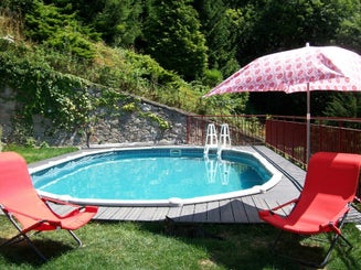 Op een zonnig plek in de tuin ligt het zwembad van 8 bij 5 meter. Het is over 1.2 meter diep en ideaal om een frisse plons te nemen. Luchtmatrassen en waterspeelgoed maken het tot een waar waterfestijn.